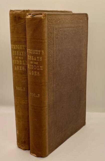 (Two Volume Set) Essays on Subjects Connected with the Literature, Popular Superstitions, and History of England in the Middle Ages by Thomas Wright, published in 1846. Sections Include: Anglo-Saxon Poetry, Chansons de Geste or Historical Romances of the Middle Ages, The Anglo-Saxon Poets of the Twelfth Century, On Dr. Grimm’s German Mythology, on the National Fairy Mythology of England, On the Popular Superstitions of Modern Greece, On Friar Rush and the Frolicsome Elves, etc. etc. Both volumes hardcover with blind stamp decorated boards with shelfwear to corners and ends.