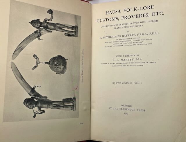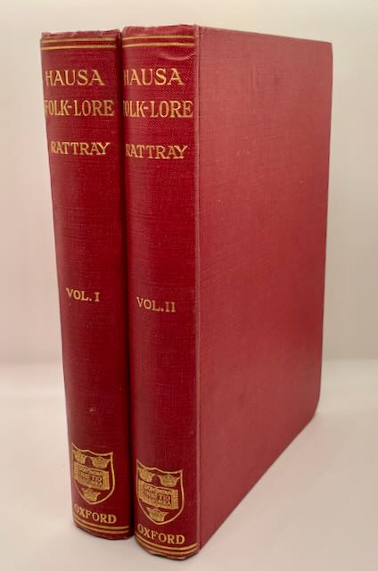 (Two Volume Set) Hausa Folk-Lore Customs, Proverbs Etc. Collected and Transliterated with English Translation and Notes by R. Suthernland Rattray with a Preface by R.R. Merett, published in 1913. A comprehensive look into the rich cultural heritage of the Hausa people, a major ethnic group in West Africa. A student of Marrett, Rattray recognized the sophistication of the traditional literatures and engaged Hausa malams, trained in Arabic script, who amassed hundreds of sheets of manuscript. The stories, customs, and proverbs in the book are presented in their original Hausa language on one side, with a transliteration into the Roman alphabet for ease of reading and notes to provide context and explication for readers unfamiliar with the Hausa language and culture. The book is an invaluable resource for scholars of African folklore, anthropology, and cultural studies, as well as anyone interested in learning more about the Hausa people and their traditions. An exceptionally bright set of the first edition.