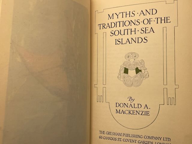 Myths and Traditions of the South Sea Islands by Donald A. MacKenzie, circa 1920. Sections Include: The Coral Islands of the Pacific, Searches for Jade, Jade Symbolism in Various Lands, The Maori God-Axe, The Asiatic Dragon in Polynesia, Mummies as Gods, Egyptian Links with Polynesia, Ancient Mariners and the Diffusion of Culture, Island Megalithic Remains, The Micronesian Venice, Creation Myths, Traditions of the Deluge, Symbolism of the Tiki, Tangoloa the Creator, The Sea God and Culture Hero, the Fire Walk in Polynesia, etc. etc. Illustrated with plates. Hardcover with gilt decorated boards, light shelfwear and light fading to boards.