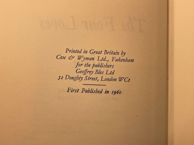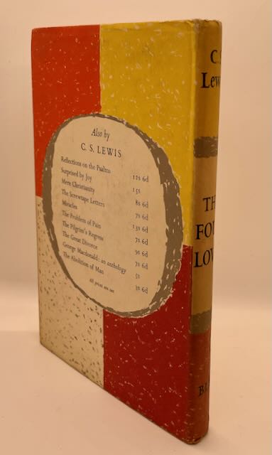 The Four Loves by C.S. Lewis, published in 1960. First British Edition. Explores the nature of love from a Christian and philosophical perspective through thought experiments. The book was based on a set of radio talks from 1958, which were criticised in the U.S. at the time for their frankness about sex. Hardcover with original jacket with very light shelfwear to jacket, price clipped.