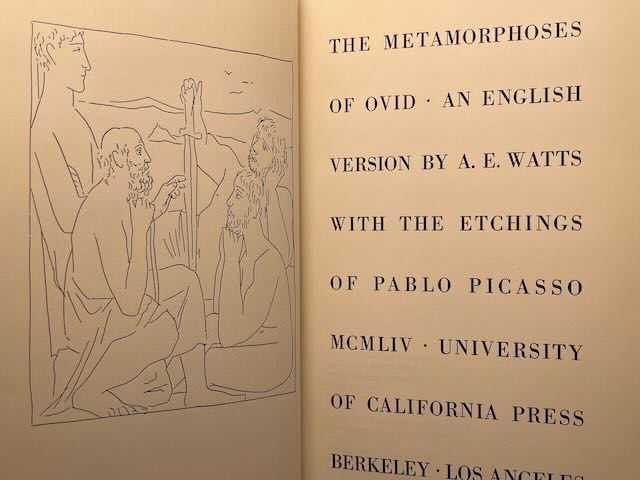 The Metamorphoses of Ovid an English Version by A. E. Watts with Etchings by Pablo Picasso, published in 1954. A highly regarded translation the Metamorphosis the encyclopedia of ancient mythology from the time of its original publication down through the Middle Ages and the Renaissance. Hardcover with original dust jacket with shelfwear to corners and ends of jacket.