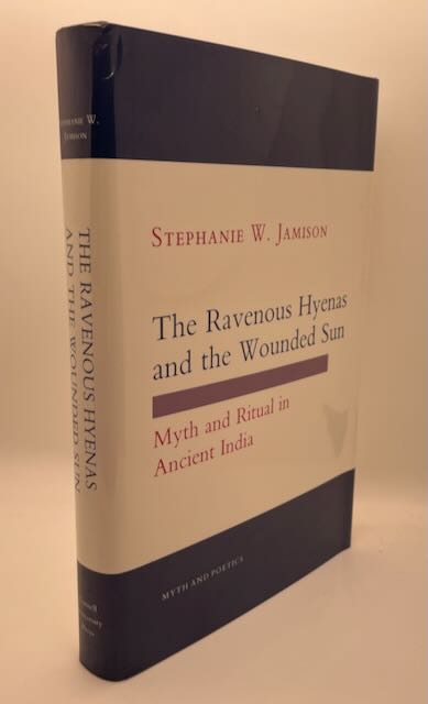 The Ravenous Hyenas and the Wounded Sun: Myth and Ritual in Ancient India by Stephanie W. Jamison, published in 1991. “Vedic Sanskrit literature contains a wealth of material concerning the mythology and religious practices of India between 1500 and 500 B.C.E.―a crucial period in the formation of traditional Indian culture. Stephanie W. Jamison here addresses the conditions that have limited our understanding of Vedic myth and ritual, such as the profusion and obscurity of the texts and the tendency on the part of scholars to approach mythology and ritual independently. Tracing two key myths through a variety of texts, Jamison provides insight into the relationship between early Indic myth and ritual as well as offering a new methodology for their study. After a brief survey of Vedic literature and religion, Jamison examines the recurrences of the myths “Indra fed the Yatis to the hyenas” and “Svarbhanu pierced the sun with darkness.” Focusing on their verbal form and ritual setting, she essays a general interpretation of the myths and their ritual purpose. Her book sheds new light on some central figures in Vedic mythology and on the evolution of Vedic mythological narrative, and it points to parallels in other cultures as well.” Hardcover with original jacket with only the lightest if any shelfwear.