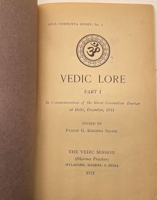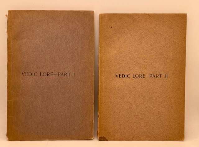 (Two Volume Set) Vedic Lore edited by Pandit G. Krishna Sastri, published in 1913 by The Vedic Mission as part of the Arya Siddhanta Series in Commemoration of the Great Coronation Dunbar at Delhi, December, 1911. Softcover as issued with paper covers with shelfwear to corners and ends, but holding well. Uncommon, little lecture booklets.